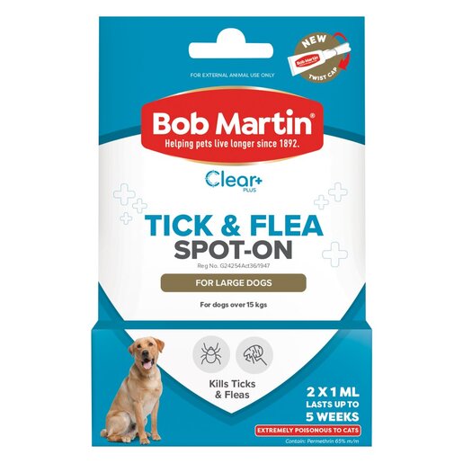 Bob Martin Clear+ Spot-On for Large Dogs will give your dog up to 5 weeks of protection against ticks and fleas.