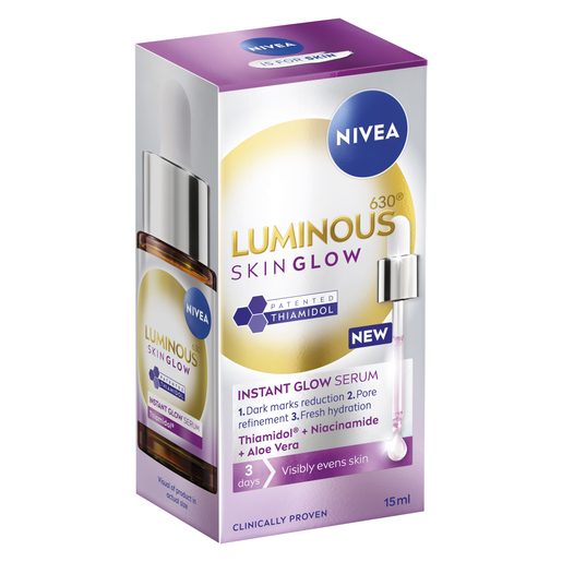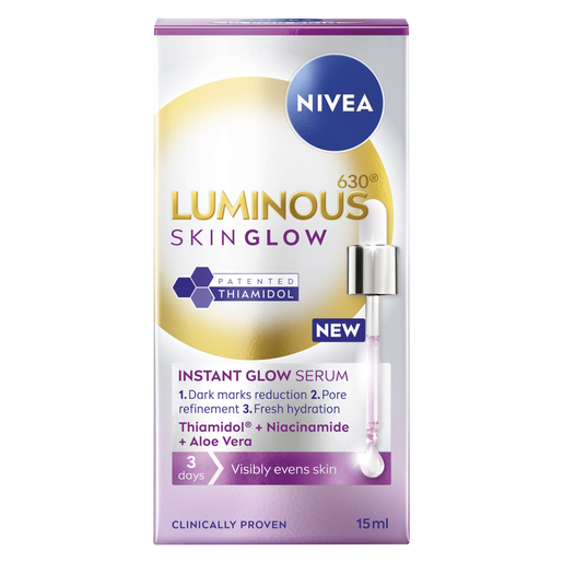Reduce spots, refine pores and hydrate skin with NIVEA Luminous630 Skin Glow Instant Glow Serum, with Thiamidol, niacinamide and aloe vera. Clinically proven to boost radiance in 2 weeks and even skin tone in 3 days, its lightweight, fast-absorbing formula leaves skin refreshed and glowing.