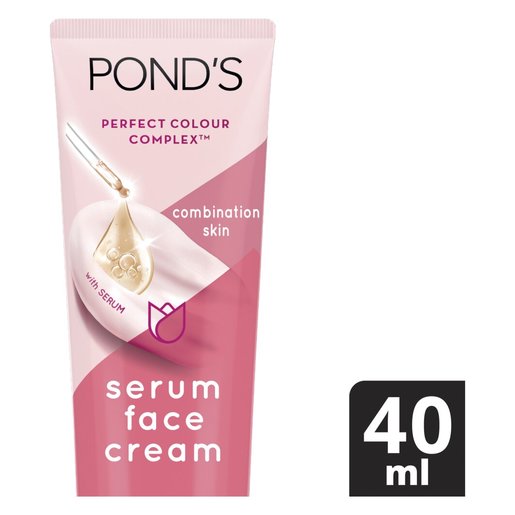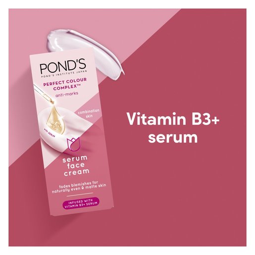 Pond’s Perfect Colour Complex Anti Blemish Serum Face Cream Moisturizer for combination skin is formulated with advanced vitamin B3+ serum. It works deep within the epidermis to fade blemishes and help give you smoother and more even toned, radiantly healthy-looking skin. This beauty cream has been clinically proven to fade blemishes in 2 weeks*. The non-greasy face cream moisturizer works with your skin to give you a natural-looking glow all day. This all-in-one serum skin cream nourishes and hydrates your skin for a smooth, more even appearance and healthy-looking glow. It absorbs quickly, leaving you with an instant matte look in the areas where you need it most and giving you all-day oil control. A daily skin care routine that includes cleansing, toning and moisturizing will help to hydrate skin and fade blemishes, keeping your skin looking and feeling smooth and soft. Pond’s helps you to keep your skin clean, clear, and refreshed with an easy daily skin care regimen that is quick and simple. After cleansing thoroughly with your preferred face wash and preparing your skin with your toning lotion, massage this serum face cream moisturizer onto your neck and face using gentle circular movements until completely absorbed. For best results, use twice daily.*with continued daily use.