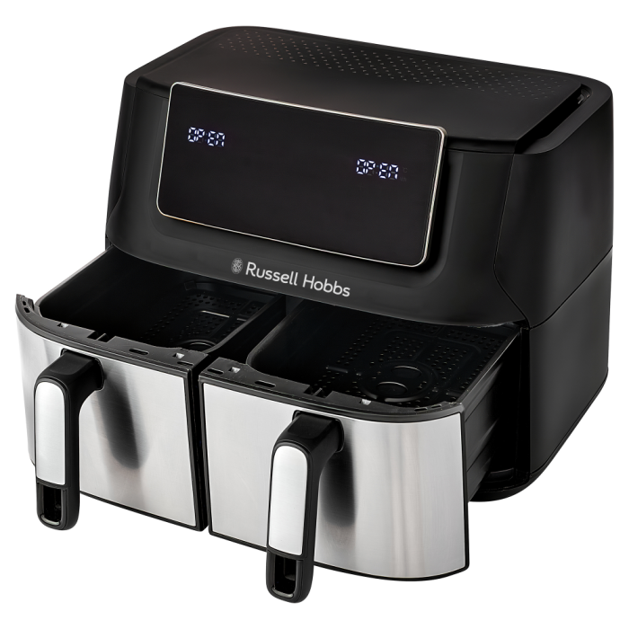 The 9L Digital Dual Air Fryer features two spacious 4.5L baskets—perfect for busy households and big appetites. Cook full meals or cater to different tastes with ease.