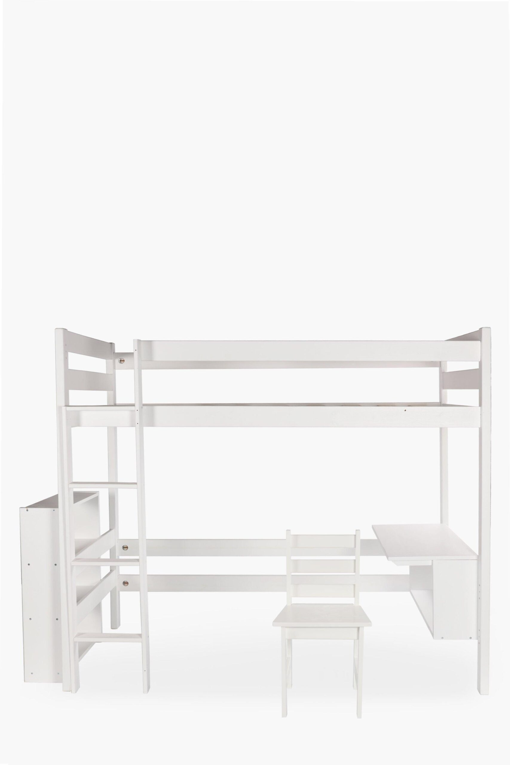 The excitement of getting to sleep on a bunk bed makes bed time a fun adventure for children. This bunk bed is made with pine wood and comes with a ladder, desk chair and a shelving unit.
